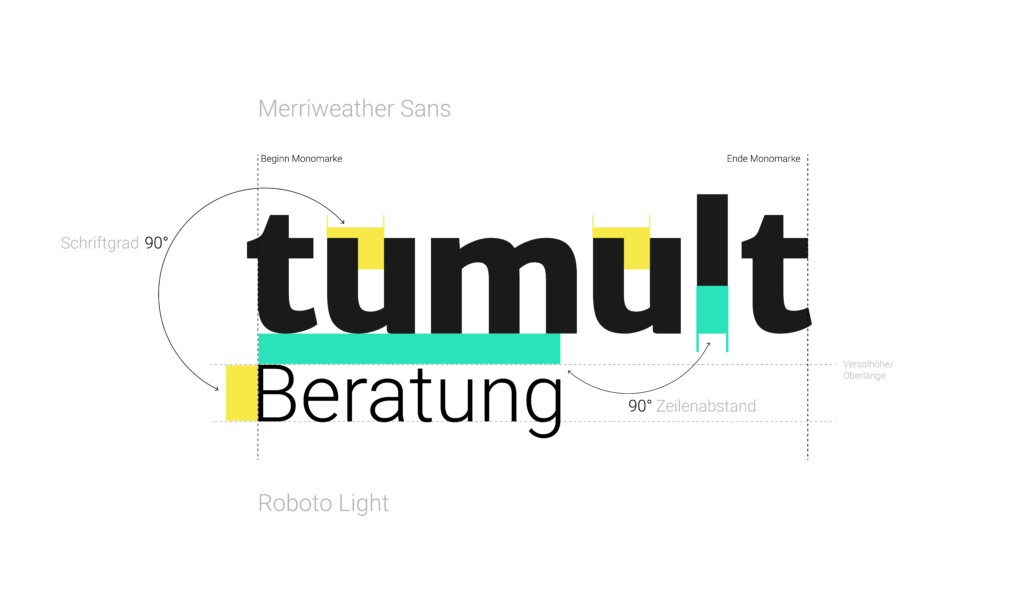 Beide Schriften werden in der kombinierten Wortmarke verwendet. Die Schrift Merriweather Sans ist im Schriftschnitt ‚black‘ die Basis des tumult Logos und für den Projektbereich wird die Roboto im Schriftschnitt ‚light‘ genutzt.
