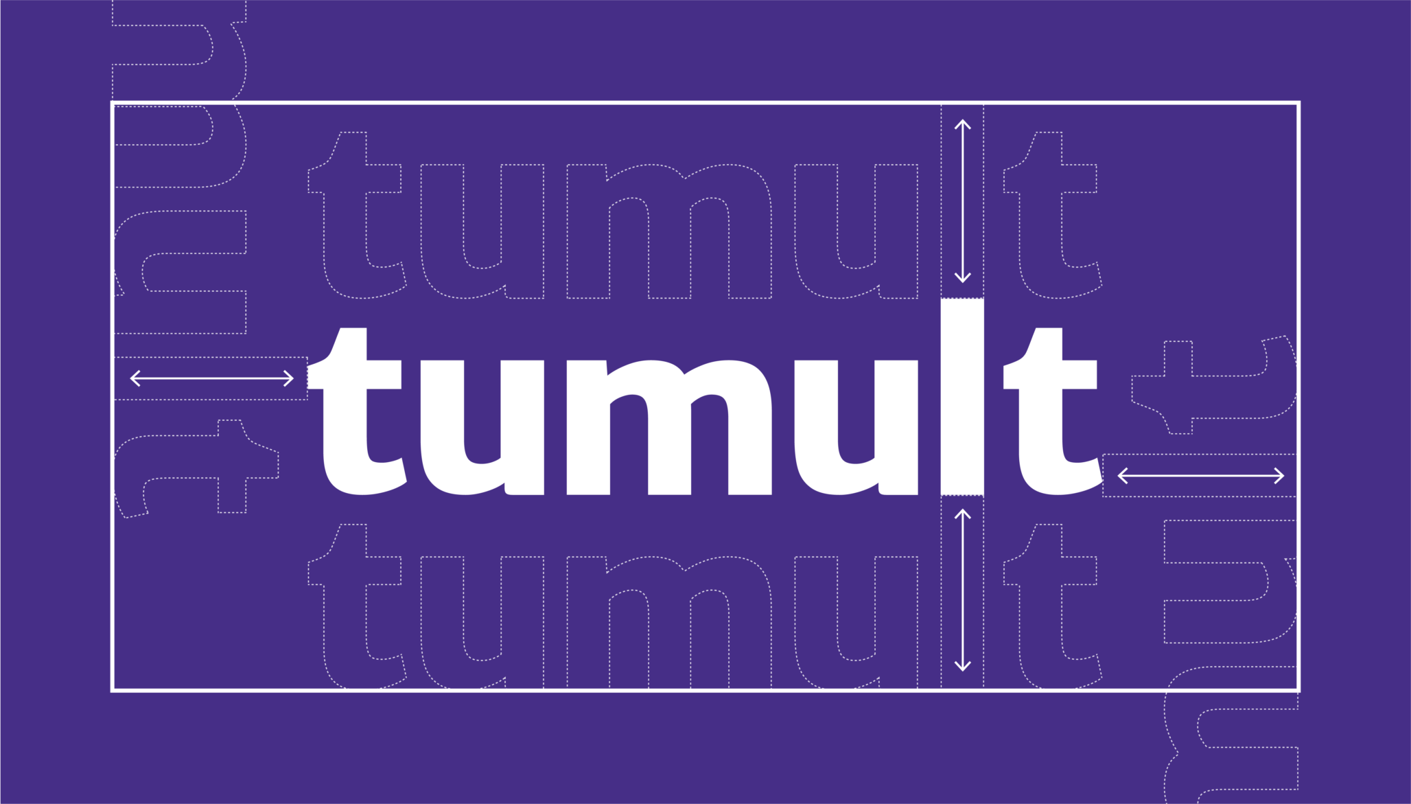 Das zentrale und immer wiederkehrende Element des Außenauftritts ist das tumult Logo. Dieses ist eine Wortmarke, was bedeutet dass der Schriftzug als solches das Logo bildet. Um die Eigenständigkeit und den Wiedererkennungswert des Logos zu erhöhen, wurde der Schriftzug grafisch aufbereitet. So sind die Abstände zwischen den Buchstaben verändert, um eine ‚gedrängte‘ Wirkung zu erzeugen und so den Wortinhalt aufzugreifen und zu unterstreichen. Auf Grund dieser Veränderungen ist es wichtig, stets die geschlossenen Logo Daten zu verwenden.