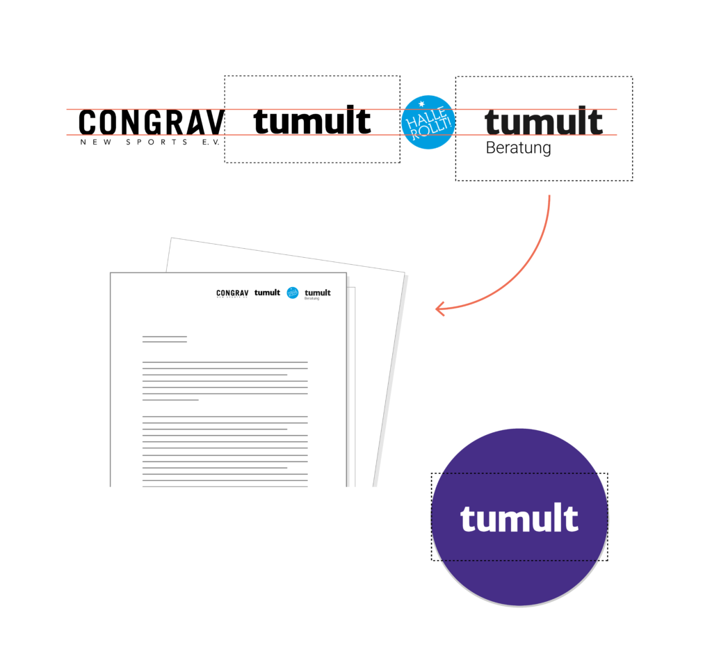 Da die Kommunikation überwiegend von einem bestimmten Unterprojekt ausgeht, ist es wichtig auch stets die jeweilige kombinierte Wortmarke zu verwenden. Die reine Dachmarke tumult wird ausschließlich für projektübergreifende Produkte/Anwendungen, wie beispielsweise Werbeartikel, verwendet. Diese klare formale Abgrenzung ist nicht zuletzt für den Endnutzer, also den jungen Menschen wichtig, um sich schnell zurecht zu finden und problemlos die jeweiligen Ansprechpartner und Akteure zu erkennen.