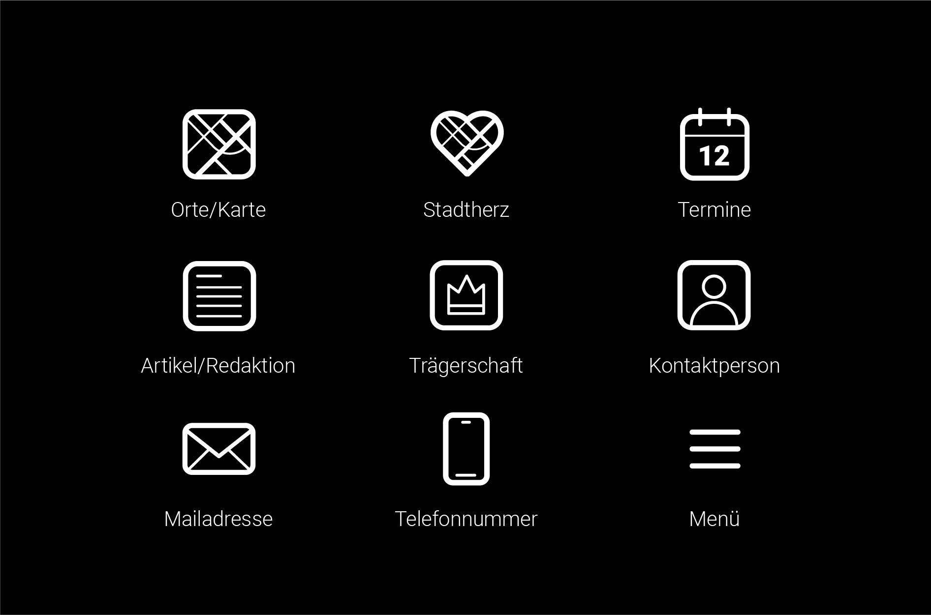 Aktuell gibt es eine kleine Anzahl eigens für die Website tumult-halle.de entwickelter Icons. Diese sind auf der nebenstehenden Darstellung erläutert und dienen der schnellen Navigation. Mit einer steigenden Komplexität des Web-Angebotes wird auch die Zahl und Vielfalt der Icons und Piktogramme noch steigen. Das markanteste Icon ist sicherlich das „Stadtherz“, welches auch an anderen Orten als der Website auftaucht (Haus der Jugend/Bus Außengestaltung). Es dient als ergänzende Grafik zum Logo, sollte aber noch nicht alleinstehend verwendet werden, da sich die Zugehörigkeit zum Projekt tumult erst etablieren muss. Alle Icons sind frei verfügbar und können auch bei anderen Produkten (Visitenkarten etc.) Verwendung finden.